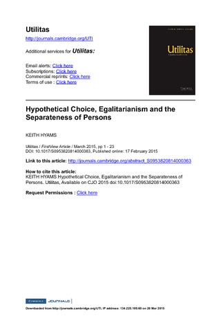 Hyams, K. (2015) Hypothetical choice, egalitarianism, and the separateness of persons. Utilitas, 27 (2). pp. 217-239. ISSN 1741-6183 doi: 10.1017/S0953820814000363