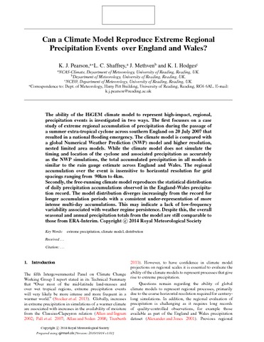 Pearson, K. J., Shaffrey, L. C. orcid id iconORCID: https://orcid.org/0000-0003-2696-752X, Methven, J. orcid id iconORCID: https://orcid.org/0000-0002-7636-6872 and Hodges, K. I. orcid id iconORCID: https://orcid.org/0000-0003-0894-229X (2014) Can a climate model reproduce extreme regional precipitation events over England and Wales? Quarterly Journal of the Royal Meteorological Society, 141 (689). pp. 1466-1472. ISSN 1477-870X doi: 10.1002/qj.2428