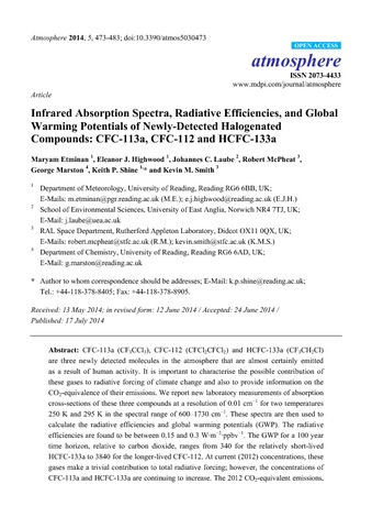 Etminan, M., Highwood, E. J., Laube, J. C., McPheat, R., Marston, G., Shine, K. P. orcid id iconORCID: https://orcid.org/0000-0003-2672-9978 and Smith, K. M. (2014) Infrared absorption spectra, radiative efficiencies, and global warming potentials of newly-detected halogenated compounds: CFC-113a, CFC-112 and HCFC-133a. Atmosphere, 5 (3). pp. 473-483. ISSN 2073-4433 doi: 10.3390/atmos5030473