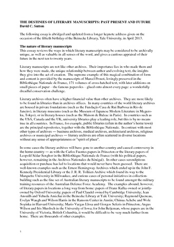 This essay reviews the ways in which literary manuscripts may be considered to be archivally unique, as well as valuable in all senses of the word, and gives a cautious appraisal of their future in the next ten to twenty years. It reviews the essential nature of literary manuscripts, and especially the ways in which they form “split collections”. This leads to an assessment of the work of the Diasporic Literary Archives network from 2012 to 2014, and some of the key findings. The essay closes with reflections on the future of literary manuscripts in the digital age – emerging trends, research findings, uncertainties and unknowns.