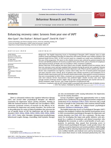 Gyani, A., Shafran, R., Layard, R. and Clark, D. M. (2013) Enhancing recovery rates: lessons from year one of IAPT. Behaviour Research and Therapy, 51 (9). pp. 597-606. ISSN 0005-7967 doi: 10.1016/j.brat.2013.06.004