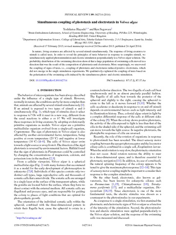 Hayashi, Y. orcid id iconORCID: https://orcid.org/0000-0002-9207-6322 and Sugawara, K. (2014) Simultaneous coupling of phototaxis and electrotaxis in Volvox algae. Physical Review E, 89 (4). 042714. ISSN 1539-3755 doi: 10.1103/PhysRevE.89.042714