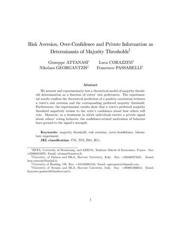 We present and experimentally test a theoretical model of majority threshold determination as a function of voters’ risk preferences. The experimental results confirm the theoretical prediction of a positive correlation between the voter's risk aversion and the corresponding preferred majority threshold. Furthermore, the experimental results show that a voter's preferred majority threshold negatively relates to the voter's confidence about how others will vote. Moreover, in a treatment in which individuals receive a private signal about others’ voting behaviour, the confidence-related motivation of behaviour loses ground to the signal's strength.