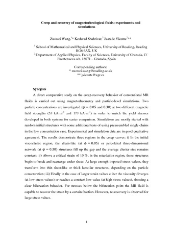 Wang, Z., Shahrivar, K. and de Vicente, J. (2014) Creep and recovery of magnetorheological fluids: experiments and simulations. Journal of Rheology, 58 (6). pp. 1725-1750. ISSN 1520-8516 doi: 10.1122/1.4891247