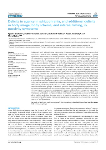Graham, K. T., Martin-Iverson, M. T., Holmes, N. P., Jablenksy, A. and Waters, F. (2014) Deficits in agency in schizophrenia, and additional deficits in body image, body schema, and internal timing, in passivity symptoms. Frontiers in Psychiatry, 5. 126. ISSN 1664-0640 doi: 10.3389/fpsyt.2014.00126