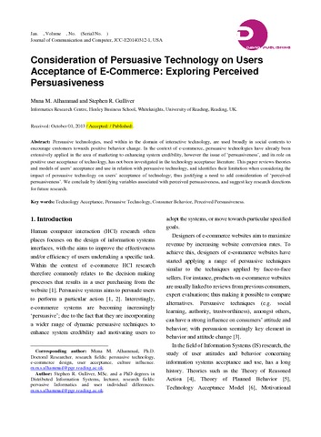 Alhammad, M. M. and Gulliver, S. orcid id iconORCID: https://orcid.org/0000-0002-4503-5448 (2014) Consideration of persuasive technology on users acceptance of e-commerce: exploring perceived persuasiveness. Journal of Communication and Computer, 11 (2). pp. 133-142. ISSN 1548-7709