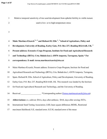 Uncontrolled Keywords | anthesis, climate change, Oryza sativa L. subsp. Japonica, panicle sterility, reproductive development, rice, seed development, seed viability, temperature stress, yield |