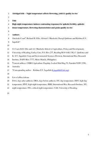High night temperature induces contrasting responses for spikelet fertility, spikelet tissue temperature, flowering characteristics and grain quality in rice