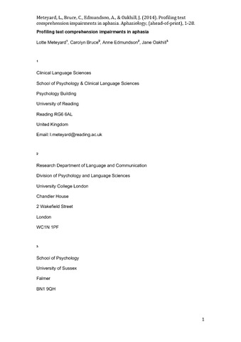 Meteyard, L., Bruce, C., Edmundson, A. and Oakhill, J. (2014) Profiling text comprehension impairments in aphasia. Aphasiology, 29 (1). pp. 1-28. ISSN 1464-5041 doi: 10.1080/02687038.2014.955388