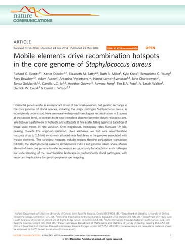 Everitt, R. G., Didelot, X., Batty, E. M., Miller, R. R., Knox, K., Young, B. C., Bowden, R., Auton, A., Votintseva, A., Larner-Svensson, H., Charlesworth, J., Golubchik, T., Ip, C. L.C., Godwin, H., Fung, R., Peto, T. E.A., Walker, A. S., Crook, D. W. and Wilson, D. J. (2014) Mobile elements drive recombination hotspots in the core genome of Staphylococcus aureus. Nature Communications, 5. 3956. ISSN 2041-1723 doi: 10.1038/ncomms4956