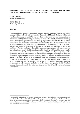Wright, C. and Cong, Z. (2014) Examining the effects of study abroad on L2 Chinese development among UK university learners. Newcastle and Northumbria Working Papers in Linguistics, 20. pp. 67-83. ISSN 2041-1057