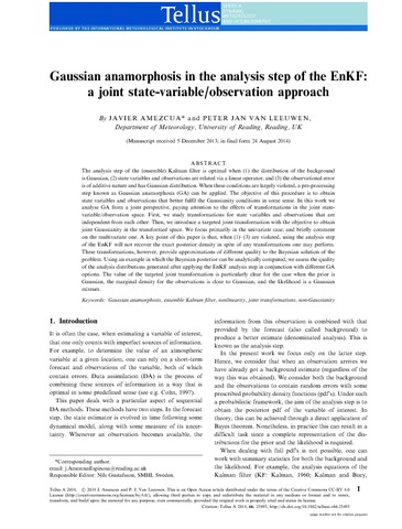 Amezcua, J. and Van Leeuwen, P. (2014) Gaussian anamorphosis in the analysis step of the EnKF: a joint state-variable/observation approach. Tellus A, 66. 23493. ISSN 1600-0870 doi: 10.3402/tellusa.v66.23493