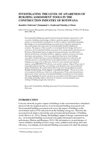 Environmental building assessment tools have been developed to measure how well or poorly a building is performing, or likely to perform, against a declared set of criteria, or environmental considerations, in order to achieve sustainability principles. Knowledge of environmental building assessment tools is therefore important for successful design and construction of environmentally friendly buildings for countries. The purpose of the research is to investigate the knowledge and level of awareness of environmental building assessment tools among industry practitioners in Botswana. One hundred and seven paper-based questionnaires were delivered to industry practitioners, including architects, engineers, quantity surveyors, real estate developers and academics. Users were asked what they know about building assessment, whether they have used any building assessment tool in the past, and what they perceive as possible barriers to the implementation of environmental building assessment tools in Botswana. Sixty five were returned and statistical analysis, using IBM SPSS V19 software, was used for analysis. Almost 85 per cent of respondents indicate that they are extremely or moderately aware of environmental design. Furthermore, the results indicate that 32 per cent of respondents have gone through formal training, which suggests ‘reasonable knowledge’. This however does not correspond with the use of the tools on the ground as 69 per cent of practitioners report never to have used any environmental building assessment tool in any project. The study highlights the need to develop an assessment tool for Botswana to enhance knowledge and further improve the level of awareness of environmental issues relating to building design and construction.