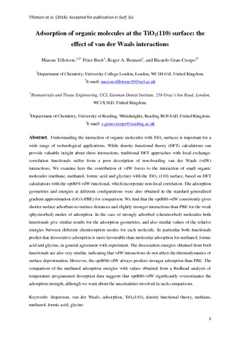Tillotson, M., Brett, P., Bennett, R. A. orcid id iconORCID: https://orcid.org/0000-0001-6266-3510 and Grau-Crespo, R. orcid id iconORCID: https://orcid.org/0000-0001-8845-1719 (2015) Adsorption of organic molecules at the TiO2(110) surface: the effect of van der Waals interactions. Surface Science, 632 (142). pp. 142-153. ISSN 0039-6028 doi: 10.1016/j.susc.2014.09.017