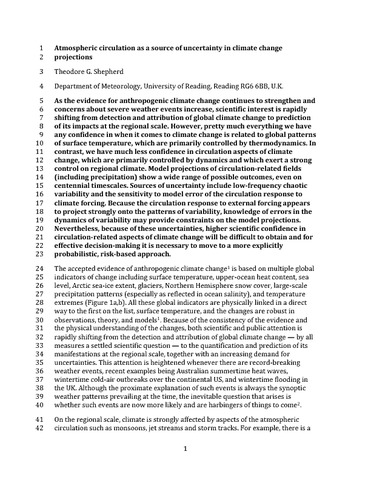 Shepherd, T.G. orcid id iconORCID: https://orcid.org/0000-0002-6631-9968 (2014) Atmospheric circulation as a source of uncertainty in climate change projections. Nature Geoscience, 7. pp. 703-708. ISSN 1752-0894 doi: 10.1038/ngeo2253
