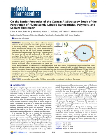 Mun, E. A., Morrison, P. W. J., Williams, A. C. orcid id iconORCID: https://orcid.org/0000-0003-3654-7916 and Khutoryanskiy, V. V. orcid id iconORCID: https://orcid.org/0000-0002-7221-2630 (2014) On the barrier properties of the cornea: a microscopy study of the penetration of fluorescently labeled nanoparticles, polymers, and sodium fluorescein. Molecular Pharmaceutics, 11 (10). pp. 3556-3564. ISSN 1543-8392 doi: 10.1021/mp500332m