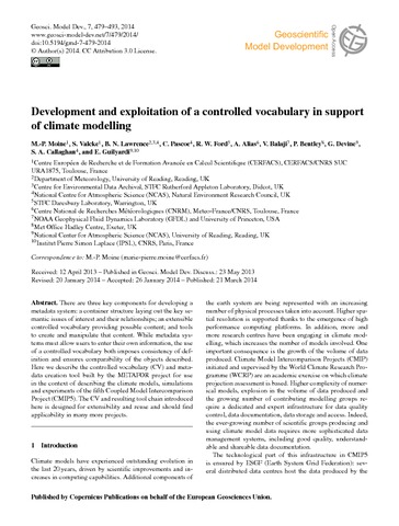 Moine, M.-P., Valcke, S., Lawrence, B. N. orcid id iconORCID: https://orcid.org/0000-0001-9262-7860, Pascoe, C., Ford, R. W., Alias, A., Balaji, V., Bentley, P., Devine, G., Callaghan, S. A. and Guilyardi, E. orcid id iconORCID: https://orcid.org/0000-0002-2255-8625 (2014) Development and exploitation of a controlled vocabulary in support of climate modelling. Geoscientific Model Development, 7 (2). pp. 479-493. ISSN 1991-9603 doi: 10.5194/gmd-7-479-2014