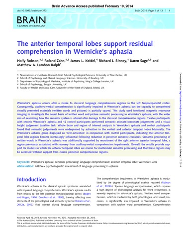 Robson, H., Zahn, R., Keidel, J. L., Binney, R. J., Sage, K. and Lambon Ralph, M. A. (2014) The anterior temporal lobes support residual comprehension in Wernicke’s aphasia. Brain : a journal of neurology, 137 (3). pp. 931-943. ISSN 1460-2156 doi: 10.1093/brain/awt373