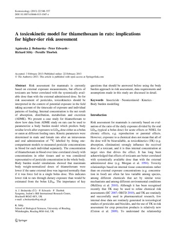 Bednarska, A. J., Edwards, P., Sibly, R. and Thorbek, P. (2013) A toxicokinetic model for thiamethoxam in rats: implications for higher-tier risk assessment. Ecotoxicology, 22 (3). pp. 548-557. ISSN 0963-9292 doi: 10.1007/s10646-013-1047-z