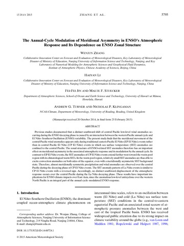 The annual-cycle modulation of meridional asymmetry in ENSO’s atmospheric response and its dependence on ENSO zonal structure.