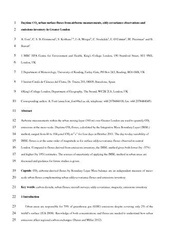Daytime CO2 urban surface fluxes from airborne measurements, eddy-covariance observations and emissions inventory in Greater London.