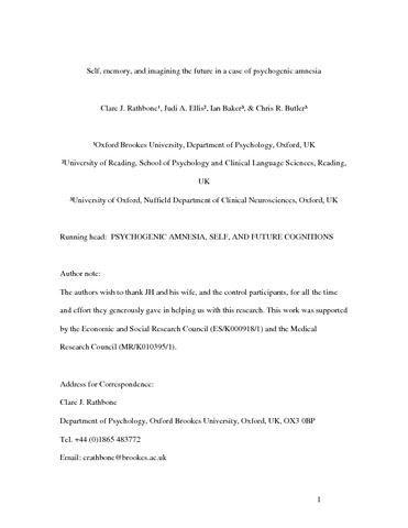 Rathbone, C., Ellis, J., Baker, I. and Butler, C. (2015) Self, memory, and imagining the future in a case of psychogenic amnesia. Neurocase, 21 (6). pp. 727-737. ISSN 1465-3656 doi: 10.1080/13554794.2014.977923