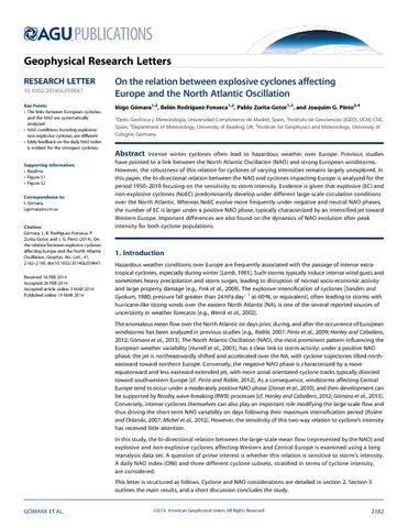 Gómara, I., Rodríguez-Fonseca, B., Zurita-Gotor, P. and Pinto, J. G. (2014) On the relation between explosive cyclones affecting Europe and the North Atlantic oscillation. Geophysical Research Letters, 41 (6). pp. 2182-2190. ISSN 0094-8276 doi: 10.1002/2014GL059647