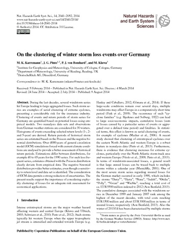 Karremann, M. K., Pinto, J. G., von Bomhard, P. J. and Klawa, M. (2014) On the clustering of winter storm loss events over Germany. Natural Hazards and Earth System Science, 14 (8). pp. 2041-2052. ISSN 1684-9981 doi: 10.5194/nhess-14-2041-2014