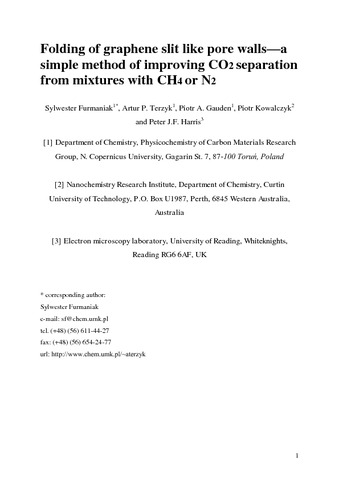 Furmaniak, S., Terzyk, A. P., Gauden, P. A., Kowalczyk, P. and Harris, P. J.F. (2014) Folding of graphene slit like pore walls—a simple method of improving CO2 separation from mixtures with CH4 or N2. Journal of Physics: Condensed Matter, 26. 485006. ISSN 1361-648X doi: 10.1088/0953-8984/26/48/485006