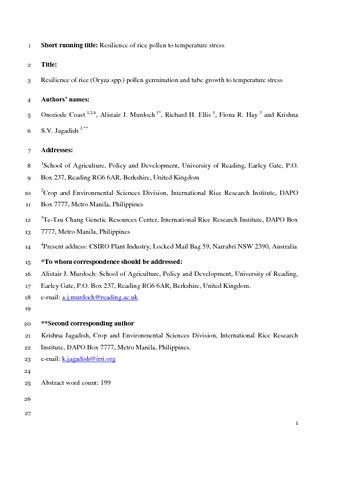 Coast, O., Murdoch, A. J., Ellis, R. H. orcid id iconORCID: https://orcid.org/0000-0002-3695-6894, Hay, F. R. and Jagadish, K. S. V. (2015) Resilience of rice (Oryza spp.) pollen germination and tube growth to temperature stress. Plant, Cell & Environment, 39 (1). pp. 26-37. ISSN 0140-7791 doi: 10.1111/pce.12475