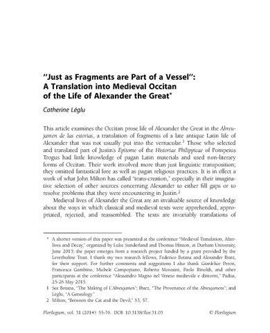Leglu, C. (2014) "Just as fragments are part of a vessel": a translation into medieval Occitan of the life of Alexander the Great. Florilegium: Journal of the Canadian Society of Medievalists/Société canadienne des médiévistes, 31. pp. 55-76. ISSN 2369-7180 doi: 10.3138/flor.31.03