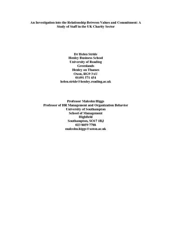 Stride, H. and Higgs, M. (2014) An investigation into the relationship between values and commitment: a study of staff in the UK charity sector. Nonprofit and Voluntary Sector Quarterly, 43 (3). pp. 455-479. ISSN 1552-7395 doi: 10.1177/0899764012472066