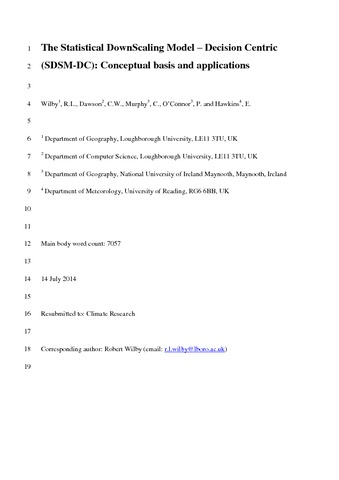Wilby, R. L., Dawson, C. W., Murphy, C., O’Connor, P. and Hawkins, E. orcid id iconORCID: https://orcid.org/0000-0001-9477-3677 (2014) The statistical downscaling model-decision centric (SDSM-DC): conceptual basis and applications. Climate Research, 61 (3). pp. 259-276. ISSN 0936-577X doi: 10.3354/cr01254