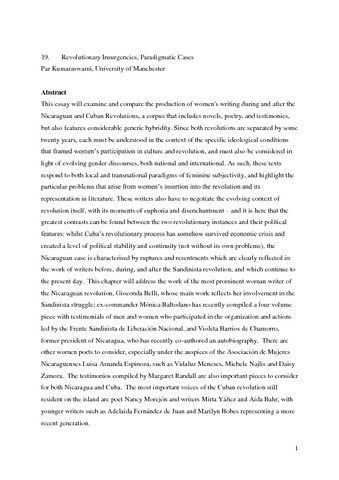 Kumaraswami, P. (2015) Revolutionary insurgencies, paradigmatic cases. In: Szurmuk, M. and Rodríguez, I. (eds.) The Cambridge History of Latin American Women's Literature. Cambridge University Press, New York, pp. 228-242.