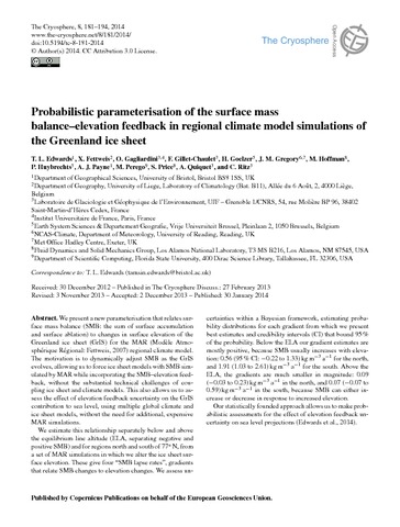 Edwards, T. L., Fettweis, X., Gagliardini, O., Gillet-Chaulet, F., Goelzer, H., Gregory, J.M. orcid id iconORCID: https://orcid.org/0000-0003-1296-8644, Hoffman, M., Huybrechts, P., Payne, A. J., Perego, M., Price, S., Quiquet, A. and Ritz, C. (2014) Probabilistic parameterisation of the surface mass balance--elevation feedback in regional climate model simulations of the Greenland ice sheet. The Cryosphere, 8 (1). pp. 181-194. ISSN 1994-0424 doi: 10.5194/tc-8-181-2014