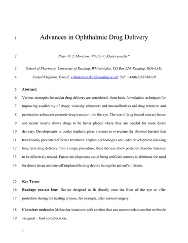 Morrison, P. W. J. and Khutoryanskiy, V. V. orcid id iconORCID: https://orcid.org/0000-0002-7221-2630 (2014) Advances in ophthalmic drug delivery. Therapeutic Delivery, 5 (12). pp. 1297-1315. ISSN 2041-5990 doi: 10.4155/tde.14.75