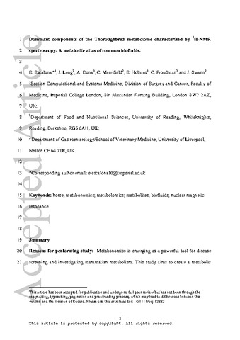 Escalona, E. E., Leng, J., Dona, A. C., Merrifield, C. A., Holmes, E., Proudman, C. J. and Swann, J. R. (2015) Dominant components of the Thoroughbred metabolome characterised by 1H‐NMR spectroscopy: a metabolite atlas of common biofluids. Equine Veterinary Journal, 47 (6). pp. 721-730. ISSN 2042-3306 doi: 10.1111/evj.12333
