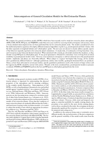 Polichtchouk, I., Cho, J. Y.-K., Watkins, C., Thrastarson, H. T., Umurhan, O. M. and de la Torre Juárez, M. (2014) Intercomparison of general circulation models for hot extrasolar planets. Icarus, 229. pp. 355-377. ISSN 0019-1035 doi: 10.1016/j.icarus.2013.11.027