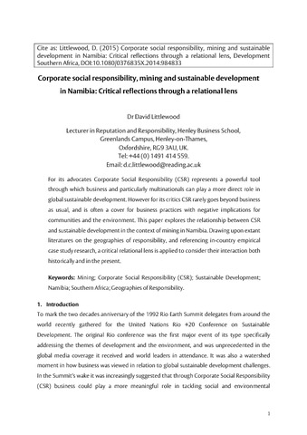 Littlewood, D. (2015) Corporate social responsibility, mining and sustainable development in Namibia: critical reflections through a relational lens. Development Southern Africa, 32 (2). pp. 240-257. ISSN 1470-3637 doi: 10.1080/0376835X.2014.984833