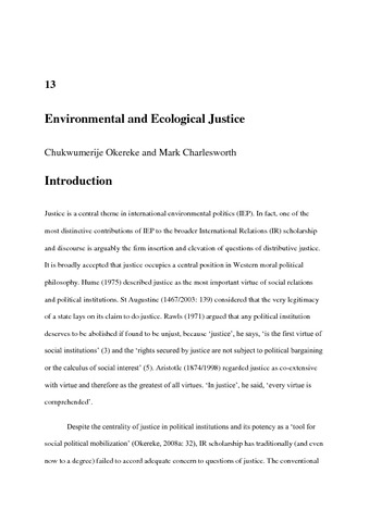 Okereke, C. and Charlesworth, M. (2014) Environmental and ecological justice. In: Betsill, M. M., Hochstetler, K. and Stevis, D. (eds.) Advances in International Environmental Politics. 2nd Edition. Palgrave Advances. Palgrave Macmilian, New York, pp. 123-147. ISBN 9781137338969