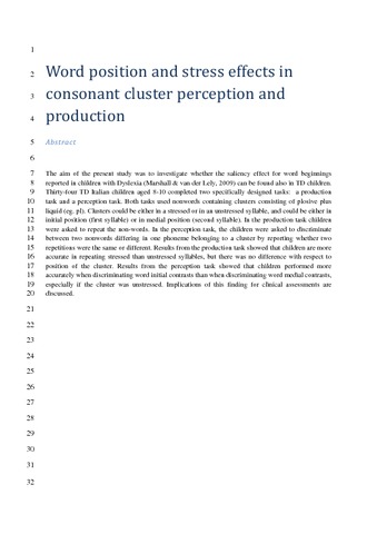 The aim of the present study was to investigate whether the saliency effect for word beginnings reported in children with Dyslexia (Marshall & van der Lely, 2009) can be found also in TD children. Thirty-four TD Italian children aged 8-10 completed two specifically designed tasks: a production task and a perception task. Both tasks used nonwords containing clusters consisting of plosive plus liquid (eg. pl). Clusters could be either in a stressed or in an unstressed syllable, and could be either in initial position (first syllable) or in medial position (second syllable). In the production task children were asked to repeat the non-words. In the perception task, the children were asked to discriminate between two nonwords differing in one phoneme belonging to a cluster by reporting whether two repetitions were the same or different. Results from the production task showed that children are more accurate in repeating stressed than unstressed syllables, but there was no difference with respect to position of the cluster. Results from the perception task showed that children performed more accurately when discriminating word initial contrasts than when discriminating word medial contrasts, especially if the cluster was unstressed. Implications of this finding for clinical assessments are discussed.