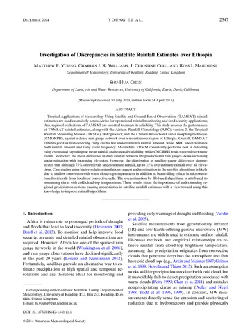 Young, M. P., Williams, C. J. R., Chiu, J. C., Maidment, R. orcid id iconORCID: https://orcid.org/0000-0003-2054-3259 and Chen, S.-H. (2014) Investigation of discrepancies in satellite rainfall estimates over Ethiopia. Journal of Hydrometeorology, 15. pp. 2347-2369. ISSN 1525-7541 doi: 10.1175/JHM-D-13-0111.1