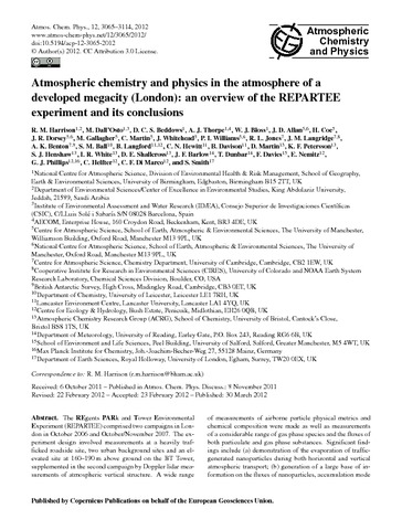 Harrison, R. M., Dall'Osto, M., Beddows, D. C. S., Thorpe, A. J., Bloss, W. J., Allan, J. D., Coe, H., Dorsey, J. R., Gallagher, M., Martin, C., Whitehead, J., Williams, P. I., Jones, R. L., Langridge, J. M., Benton, A. K., Ball, S. M., Langford, B., Hewitt, C. N., Davison, B., Martin, D., Petersson, K. F., Henshaw, S. J., White, I. R., Shallcross, D. E., Barlow, J. F., Dunbar, T., Davies, F., Nemitz, E., Phillips, G. J., Helfter, C., Di Marco, C. F. and Smith, S. (2012) Atmospheric chemistry and physics in the atmosphere of a developed megacity (London): an overview of the REPARTEE experiment and its conclusions. Atmospheric Chemistry and Physics, 12 (6). pp. 3065-3114. ISSN 1680-7316 doi: 10.5194/acp-12-3065-2012