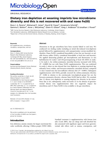Alterations in the gut microbiota have been recently linked to oral iron. We conducted two feeding studies including an initial diet-induced iron-depletion period followed by supplementation with nanoparticulate tartrate-modified ferrihydrite (Nano Fe(III): considered bioavailable to host but not bacteria) or soluble ferrous sulfate (FeSO4: considered bioavailable to both host and bacteria). We applied denaturing gradient gel electrophoresis and fluorescence in situ hybridization for study-1 and 454-pyrosequencing of fecal 16S rRNA in study-2. In study-1, the within-community microbial diversity increased with FeSO4 (P = 0.0009) but not with Nano Fe(III) supplementation. This was confirmed in study-2, where we also showed that iron depletion at weaning imprinted significantly lower within- and between-community microbial diversity compared to mice weaned onto the iron-sufficient reference diet (P < 0.0001). Subsequent supplementation with FeSO4 partially restored the within-community diversity (P = 0.006 in relation to the continuously iron-depleted group) but not the between-community diversity, whereas Nano Fe(III) had no effect. We conclude that (1) dietary iron depletion at weaning imprints low diversity in the microbiota that is not, subsequently, easily recovered; (2) in the absence of gastrointestinal disease iron supplementation does not negatively impact the microbiota; and (3) Nano Fe(III) is less available to the gut microbiota.