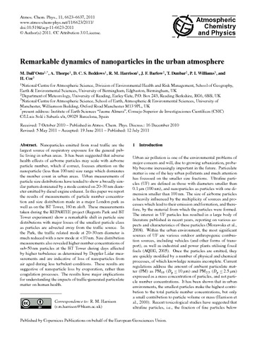 Dall'Osto, M., Thorpe, A., Beddows, D. C. S., Harrison, R. M., Barlow, J. F., Dunbar, T., Williams, P. I. and Coe, H. (2011) Remarkable dynamics of nanoparticles in the urban atmosphere. Atmospheric Chemistry and Physics, 11 (13). pp. 6623-6637. ISSN 1680-7316 doi: 10.5194/acp-11-6623-2011