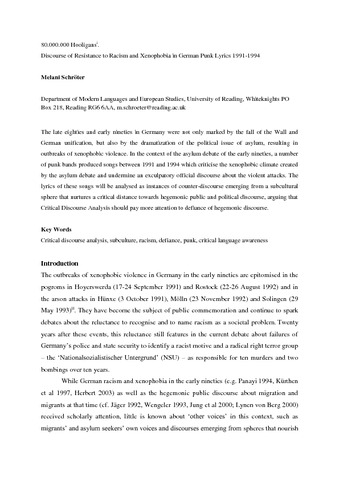 80,000,000 hooligans. Discourses of resistance to racism and xenophobia in German punk lyrics 1991-1994.