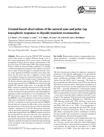 Davies, J. A., Yeoman, T. K., Rae, I. J., Milan, S. E., Lester, M., Lockwood, M. orcid id iconORCID: https://orcid.org/0000-0002-7397-2172 and McWilliams, A. (2002) Ground-based observations of the auroral zone and polar cap ionospheric responses to dayside transient reconnection. Annales Geophysicae, 20 (6). pp. 781-794. ISSN 0992-7689 doi: 10.5194/angeo-20-781-2002
