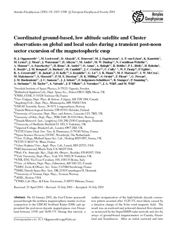 Opgenoorth, H. J., Lockwood, M. orcid id iconORCID: https://orcid.org/0000-0002-7397-2172, Alcaydé, D., Donovan, E., Engebretson, M. J., van Eyken, A. P., Kauristie, K., Lester, M., Moen, J., Waterman, J., Alleyne, H., André, M., Dunlop, M. W., Cornilleau-Wehrlin, N., Masson, A., Fazerkerley, A., Rème, H., André, R., Amm, O., Balogh, A., Behlke, R., Blelly, P. L., Boholm, H., Borälv, E., Bosqued, J. M., Buchert, S., Candidi, M., Cerisier, J. C., Cully, C., Denig, W. F., Eglitis, P., Greenwald, R. A., Jackal, B., Kelly, J. D., Krauklis, I., Lu, G., Mann, I. R., Marcucci, M. F., McCrea, I. W., Maksimovic, M., Massetti, S., Décréau, P. M. E., Milling, D. K., Orsini, S., Pitout, F., Provan, G., Ruohoniemi, J. M., Samson, J. C., Schott, J. J., Sedgemore-Schulthess, F., Stamper, R., Stauning, P., Strømme, A., Taylor, M., Vaivads, A., Villain, J. P., Voronkov, I., Wild, J. A. and Wild, M. (2001) Coordinated ground-based, low altitude satellite and Cluster observations on global and local scales during a transient post-noon sector excursion of the magnetospheric cusp. Annales Geophysicae, 19 (10/12). pp. 1367-1398. ISSN 0992-7689 doi: 10.5194/angeo-19-1367-2001