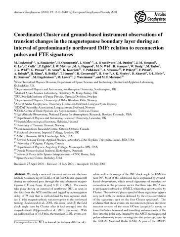 Lockwood, M. orcid id iconORCID: https://orcid.org/0000-0002-7397-2172, Fazakerley, A., Opgenoorth, H., Moen, J., van Eyken, A. P., Dunlop, M., Bosqued, J.-M., Lu, G., Cully, C., Eglitis, P., McCrea, I. W., Hapgood, M. A., Wild, M. N., Stamper, R., Denig, W., Taylor, M., Wild, J. A., Provan, G., Amm, O., Kauristie, K., Pulkkinen, T., Strømme, A., Prikryl, P., Pitout, F., Balogh, A., Rème, H., Behlke, R., Hansen, T., Greenwald, R., Frey, H., Morley, S. K., Alcaydé, D., Blelly, P.-L., Donovan, E., Engebretson, M., Lester, M., Watermann, J. and Marcucci, M. F. (2001) Coordinated Cluster and ground-based instrument observations of transient changes in the magnetopause boundary layer during an interval of predominantly northward IMF: relation to reconnection pulses and FTE signatures. Annales Geophysicae, 19 (10/12). pp. 1613-1640. ISSN 0992-7689 doi: 10.5194/angeo-19-1613-2001