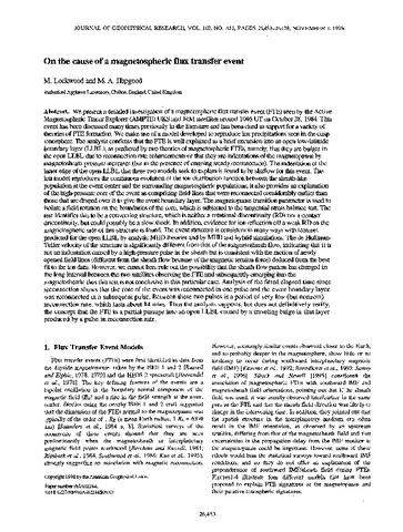 We present a detailed investigation of a magnetospheric flux transfer event (FTE) seen by the Active Magnetospheric Tracer Explorer (AMPTE) UKS and IRM satellites around 1046 UT on October 28, 1984. This event has been discussed many times previously in the literature and has been cited as support for a variety of theories of FTE formation. We make use of a model developed to reproduce ion precipitations seen in the cusp ionosphere. The analysis confirms that the FTE is well explained as a brief excursion into an open low-latitude boundary layer (LLBL), as predicted by two theories of magnetospheric FTEs: namely, that they are bulges in the open LLBL due to reconnection rate enhancements or that they are indentations of the magnetopause by magnetosheath pressure increases (but in the presence of ongoing steady reconnection). The indentation of the inner edge of the open LLBL that these two models seek to explain is found to be shallow for this event. The ion model reproduces the continuous evolution of the ion distribution function between the sheath-like population at the event center and the surrounding magnetospheric populations; it also provides an explanation of the high-pressure core of the event as comprising field lines that were reconnected considerably earlier than those that are draped over it to give the event boundary layer. The magnetopause transition parameter is used to isolate a field rotation on the boundaries of the core, which is subjected to the tangential stress balance test. The test identifies this to be a convecting structure, which is neither a rotational discontinuity (RD) nor a contact discontinuity, but could possibly be a slow shock. In addition, evidence for ion reflection off a weak RD on the magnetospheric side of this structure is found. The event structure is consistent in many ways with features predicted for the open LLBL by analytic MHD theories and by MHD and hybrid simulations. The de Hoffman-Teller velocity of the structure is significantly different from that of the magnetosheath flow, indicating that it is not an indentation caused by a high-pressure pulse in the sheath but is consistent with the motion of newly opened field lines (different from the sheath flow because of the magnetic tension force) deduced from the best fit to the ion data. However, we cannot here rule out the possibility that the sheath flow pattern has changed in the long interval between the two satellites observing the FTE and subsequently emerging into the magnetosheath; thus this test is not conclusive in this particular case. Analysis of the fitted elapsed time since reconnection shows that the core of the event was reconnected in one pulse and the event boundary layer was reconnected in a subsequent pulse. Between these two pulses is a period of very low (but nonzero) reconnection rate, which lasts about 14 mins. Thus the analysis supports, but does not definitively verify, the concept that the FTE is a partial passage into an open LLBL caused by a traveling bulge in that layer produced by a pulse in reconnection rate.